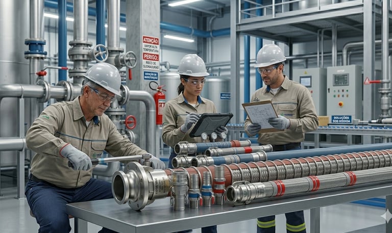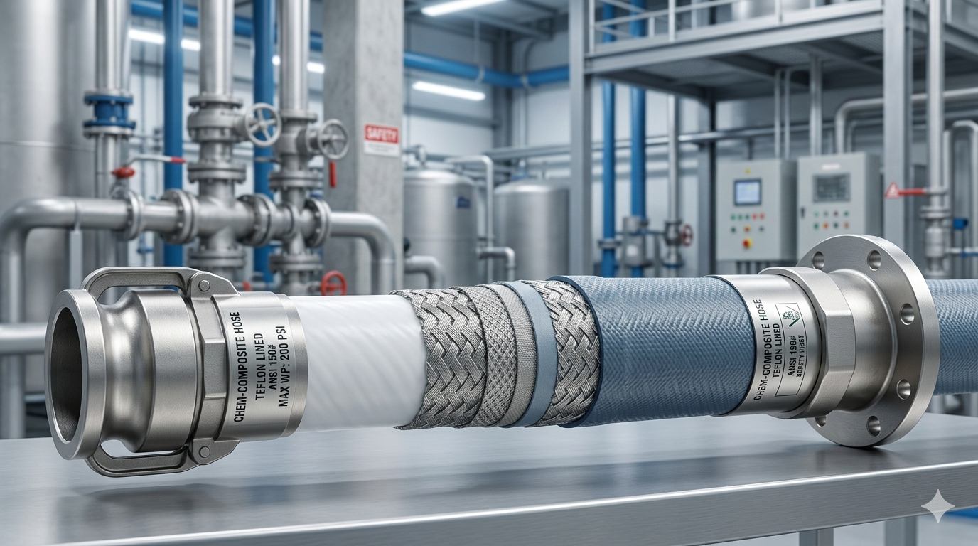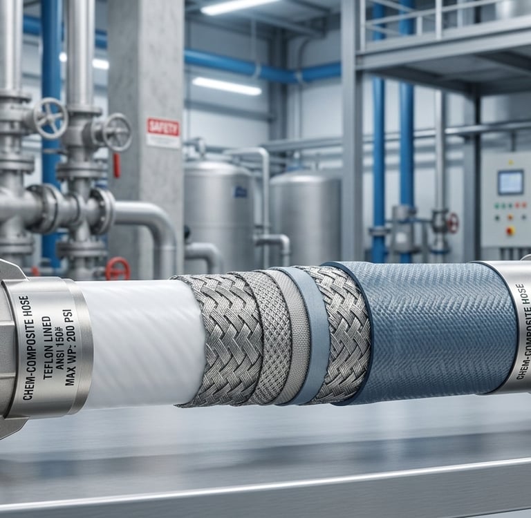 Mangueiras e mangotes químicos em teflon, projetados para trabalhar com fluidos agressivos em processos químicos, petroquímicos e gases. Alta resistência, segurança operacional e desempenho confiável para linhas de transferência críticas.